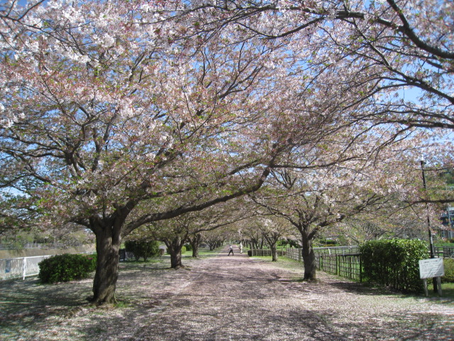 4/11現在、引地川親水公園内におけるソメイヨシノの開花状況は半散りとなっております。(大部分が葉桜)